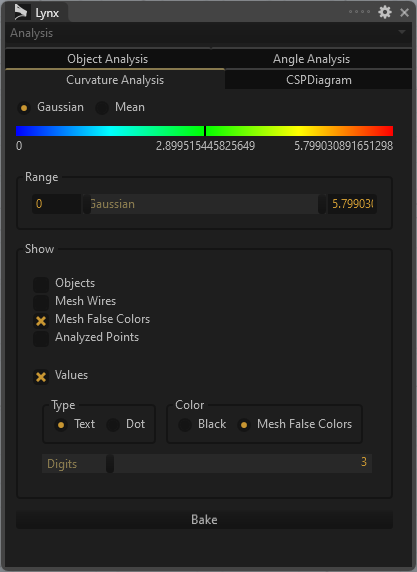 The Curvature Analysis command analyzes surface curvature using false color mapping (meshes and/or points), texts or an annotation dots.